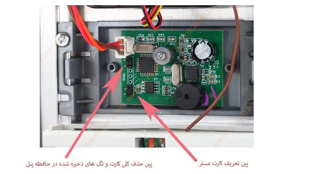 گاه اما نیاز به حذف کارت ها از حافظه پنل نیز حس می گردد. حال این نیاز می تواند به عللی مانند دلایل امنیتی، تغییر شخص یا اشخاص استفاده کننده و یا مفقود شدن یک کارت یا تگ که مشخصا امنیت سازه را به خطر می اندازد باشد. برای این کار کافیست ابزار جامپر را روی 2 پین بالایی برد کارت خوان پنل قرار دهیم تا صدای بوق ممتد از پنل شنیده شود، بعد Jumper را خارج می کنیم، مجدد صدای بوق متقاطع را خواهیم شنید و پس از قطع بوق، به همین سادگی حافظه پنل درب ورودی ما خالی از کارت یا تگ NFC شده است و پس از آن در صورت نزدیک کردن کارت ها خواهیم دید پنل عمل نکرده و با صدای بوقی مانند صدای Error، عدم شناختن آن کارت یا تگ را اعلام می کند.