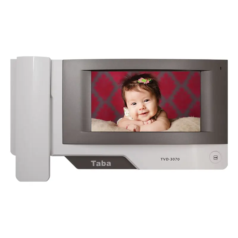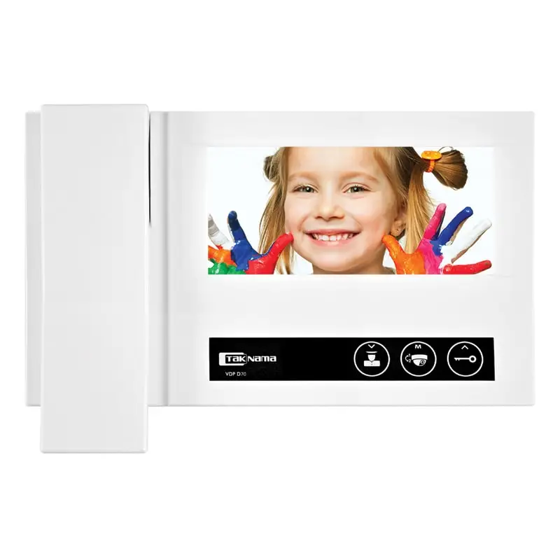 درب بازکن تصویری TVD-5-70 تابا دارای مانیتور 7 اینچی با تکنولوژی TFT-LCD ساخته شده تا تصاویر نمایش داده با بالا ترین سطح کیفیت تصویری نشان داده شود . این صفحه نمایش غیر لمسی تصاویر انتقالی از پنل زنگ دم دری با کیفیت مناسب در اختیار نمایشگر و کاربر قرار می دهد. تمام تنظیمات و فعالیت های این دستگاه با 5 دکمه ای که در زیر مانیتور و کناره آیفون تصویری ایرانی قرار دارند انجام می شود. نمایشگر درون منزلی TVD-5-70 یکی از مدل هایی که است که در آن شما با کمک سیستم عامل گرافیکی به راحتی می توانید به منوی اصلی دسترسی پیدا کنید و تنظیمات دستگاه خود را تغییر دهید به این صورت که بعد از روشن کردن دستگاه با زدن دکمه MENU که با شکل مربع 4 قسمت شده دیده میشود، هشت آیتم را در مقابل خود مشاهده می کنید که به ترتیب شامل تنظیمات، تاریخ و زمان، حذف تمامی عکس و فیلم ها، کپی کردن در کارت حافظه، ضبط اتوماتیک، ریست کردن دستگاه، تنظیم زنگ و کارت حافظه می باشند که با استفاده از دو دکمه بالا و پایین سیستم مقادیر هر کدام گزینه های نام برده را می توانید تغییر دهید.