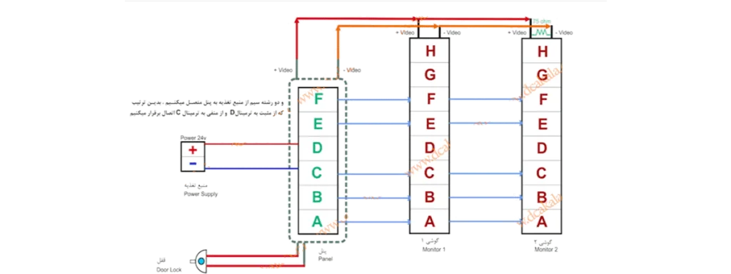 در این مدل نمایشگر رنگی 8 ورودی که با حروف انگلیسی از A تا H نام گذاری شده است که تنها از درگاه های A،B،C،D،E،F استفاده میشود. در اولین قدم قبل از عبور جریان از درگاه های A،B،E،F زنگ دم دری به هر تعداد پنل درون منزلی که داریم متصل میکنیم. بعد اتصال سیم های درگاه های نامبرده شده از دو خروجی VIDEO +و VIDEO – پنل دم دری به ورودی های VIDEO + و VIDEO – آیفون رنگی سیم کشی میکنیم. پس از اتصال آیفون تصویری به این مورد توجه داشته باشید که باید به سیم های آخرین آیفون مقاومت 75 اهم متصل کنید تا به تماشای تصاویر دوربین مداربسته و پنل آیفون تصویری بپردازید. پس از اطمینان حاصل کردن از نصب صحیح سیم ها و لحیم کاری تمامی آن ها از ترانس 24 ولت تکنما دو رشته سیم مثبت و منفی به ورودی های C و D متصل کنیم و از خروجی C پنل به دیگر آیفون تصویری ها سیم کشی میکنیم.